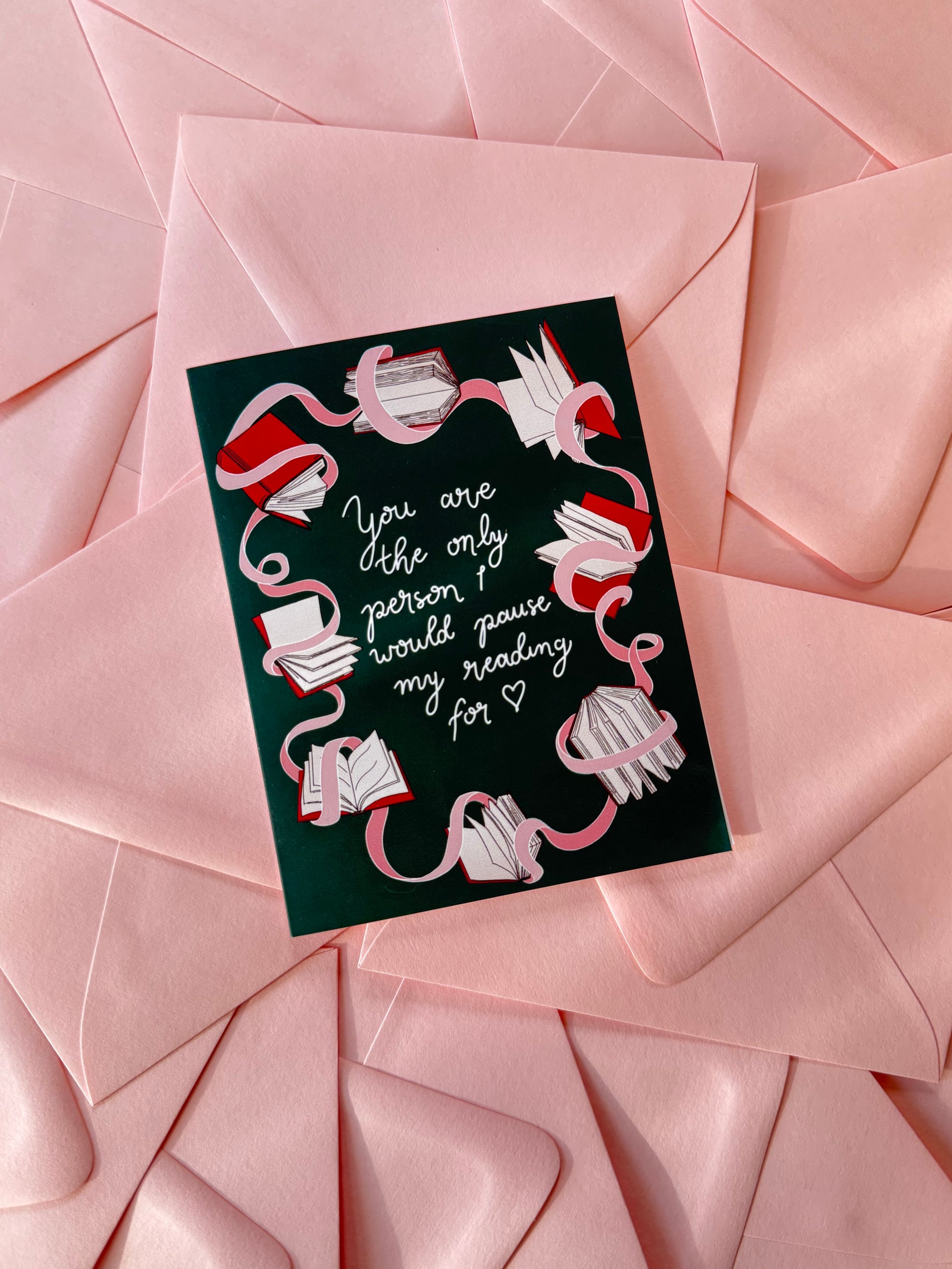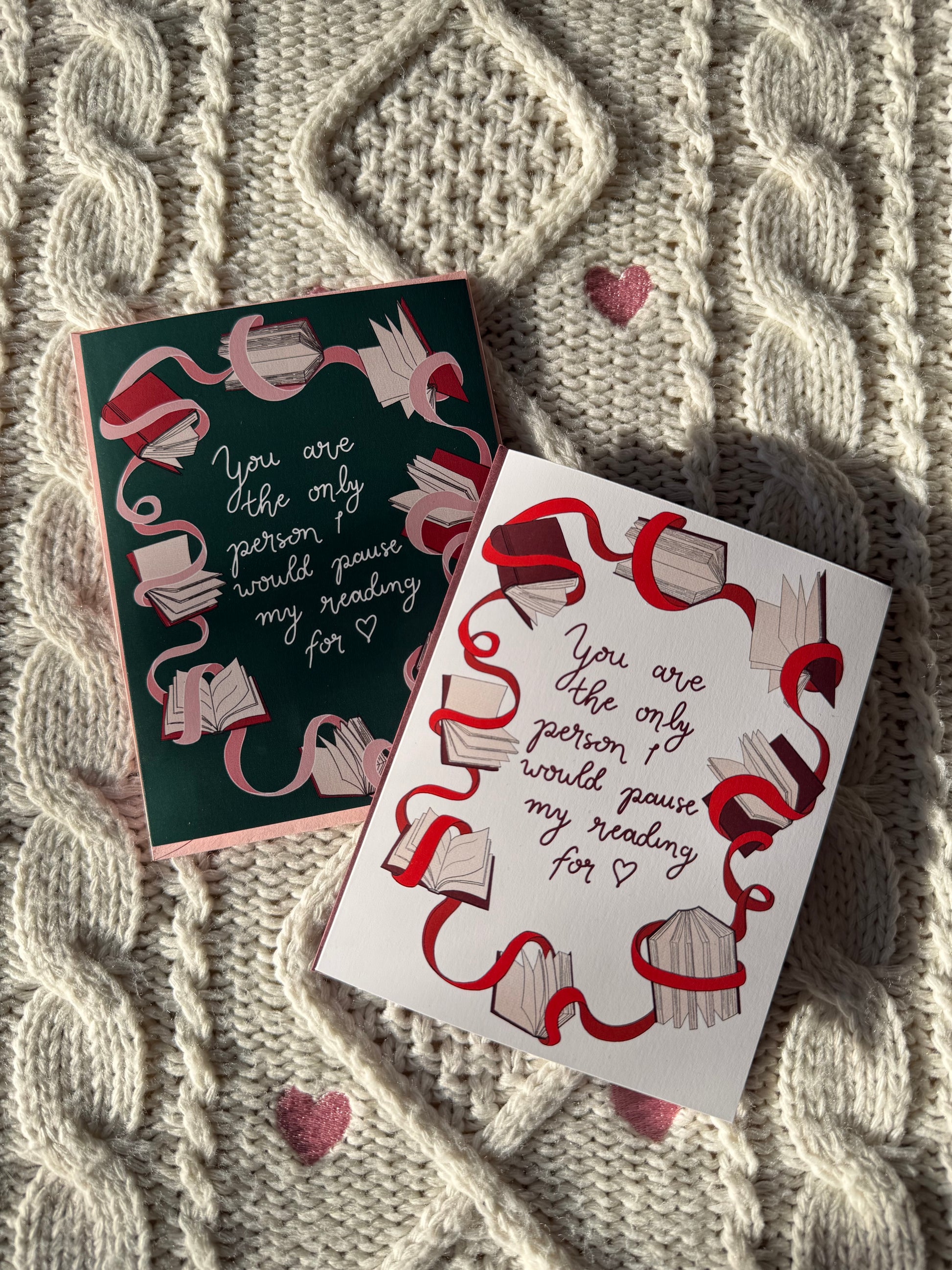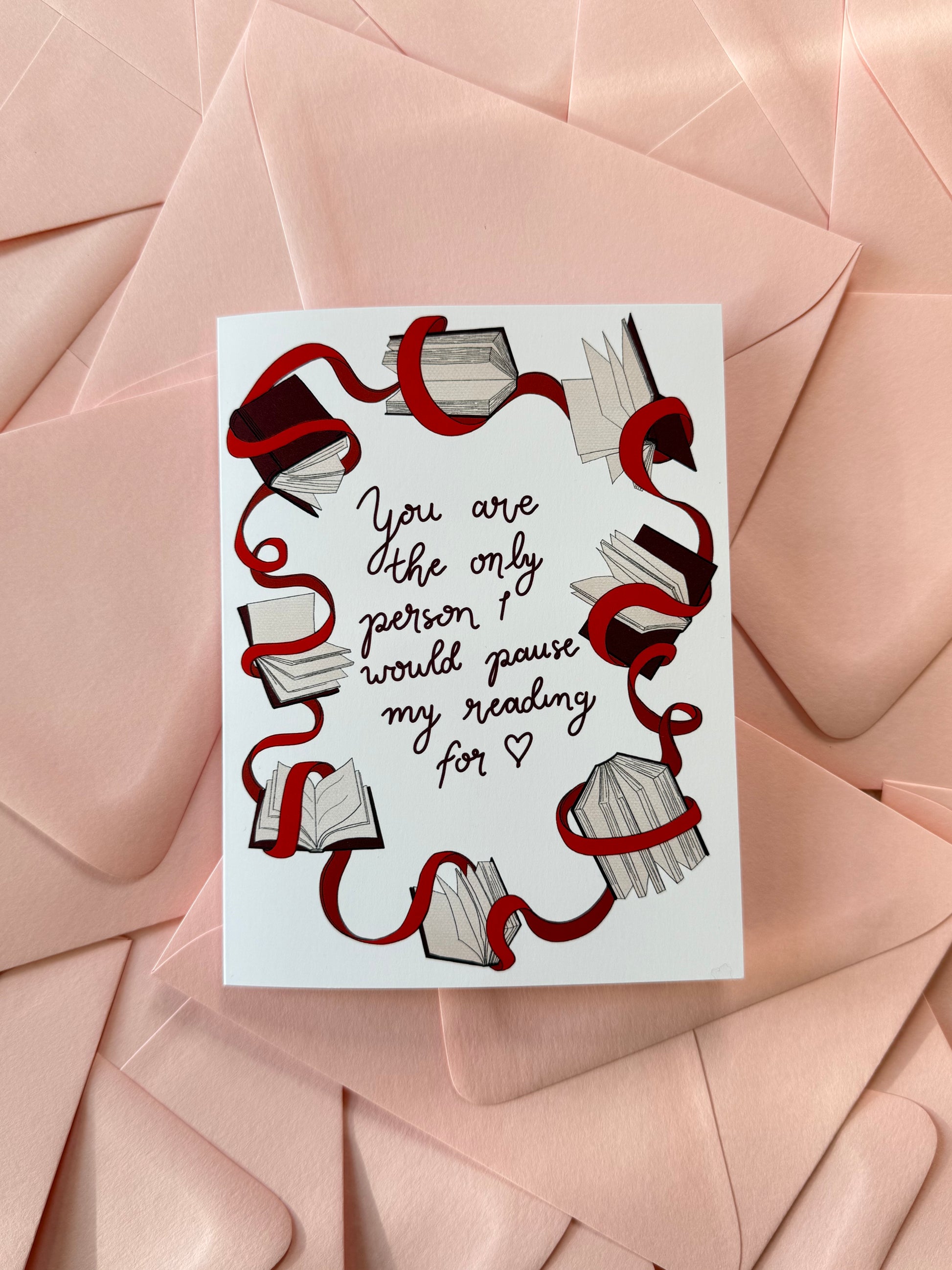 Celebrate love with a bookish twist! This charming Valentine's Day card features stacked books adorned with delicate ribbons, perfect for the reader in your life. Available in two color ways, it's an ideal way to express affection to fellow book lovers. Whether you're gifting it to a partner, friend, or fellow bibliophile, this card captures the magic of pausing a good story for something even better, love.